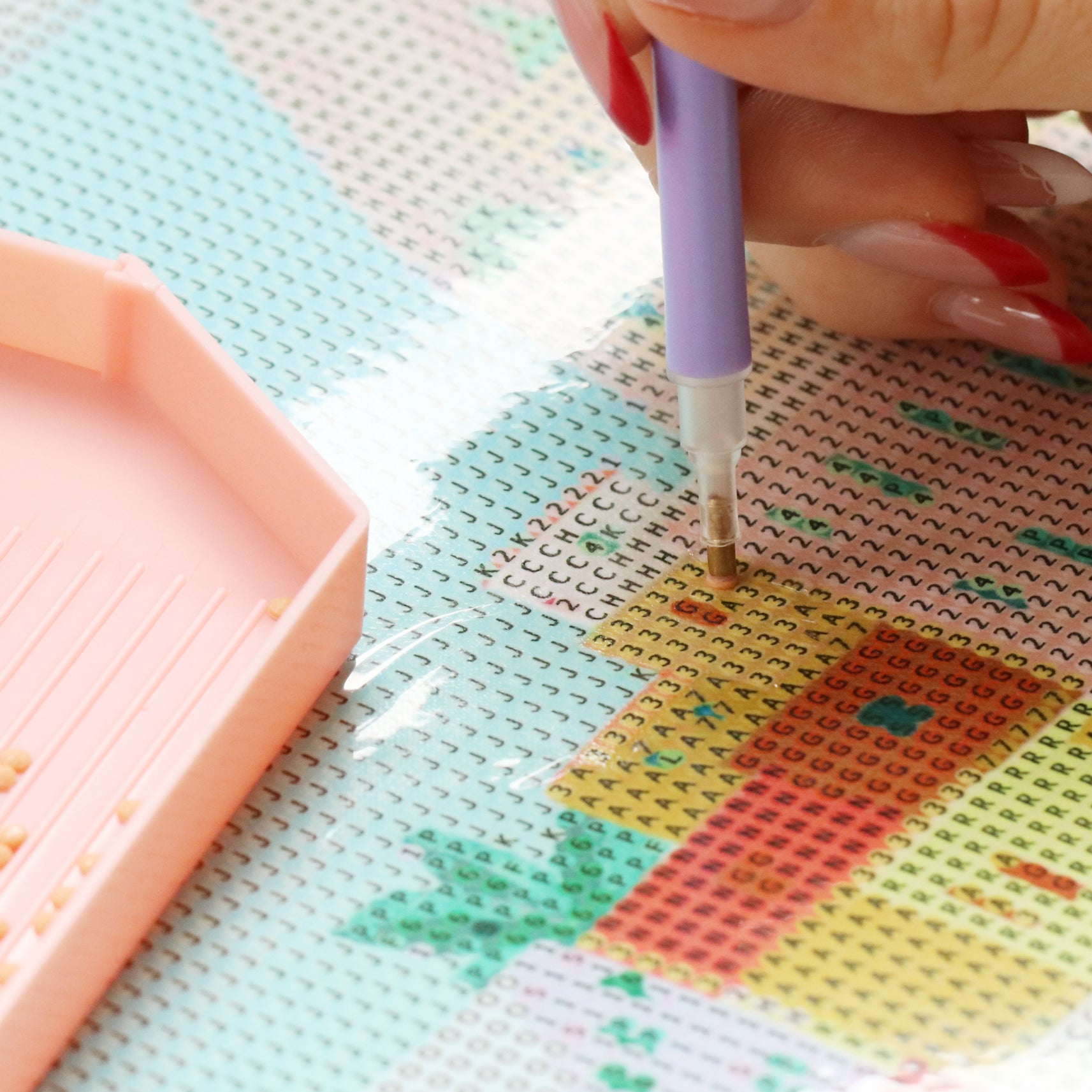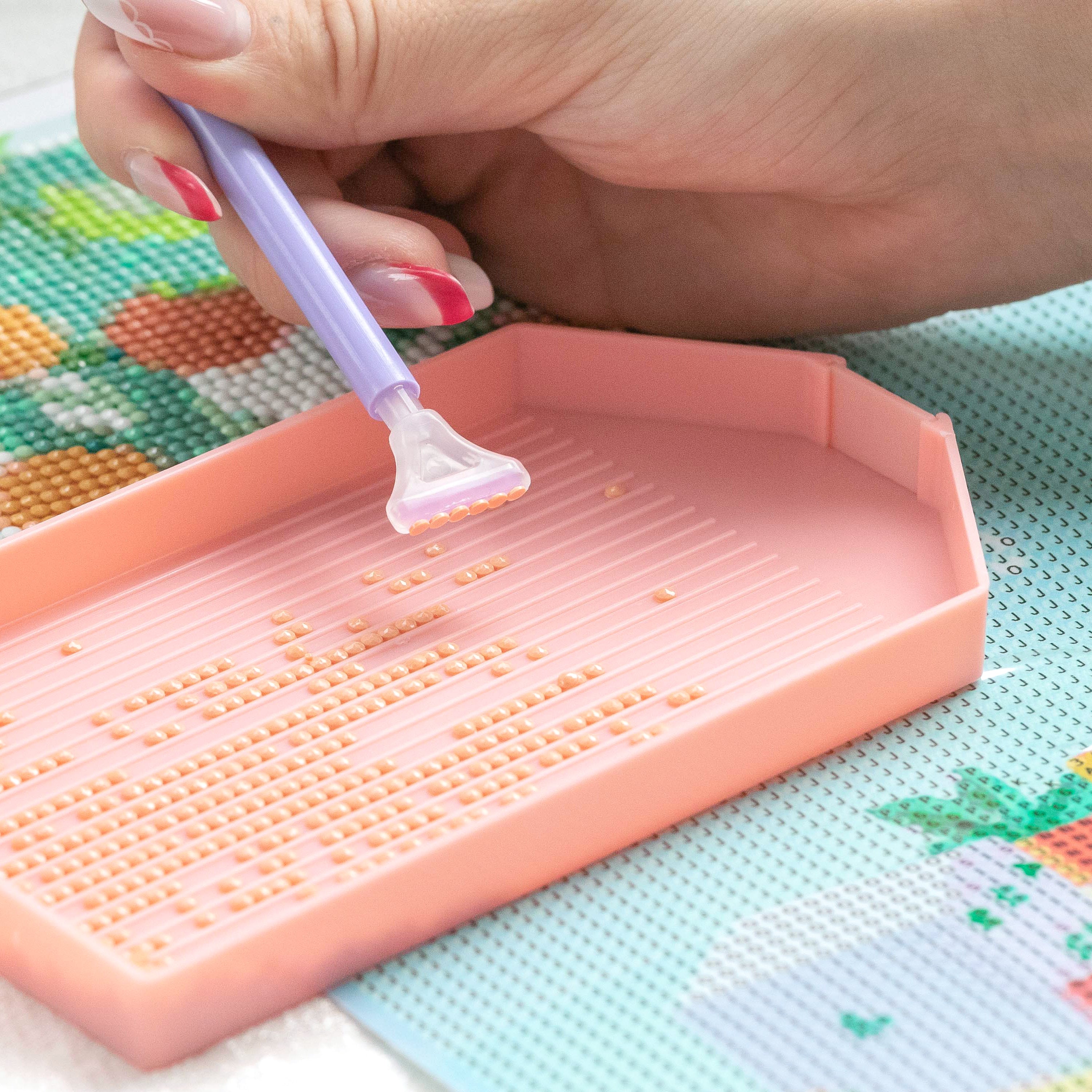 ✦ Attrapez les diamants un à un (ou en groupes avec les embouts larges) et déposez-les délicatement sur la toile, en alignant bien chaque diamant dans la case correspondante.