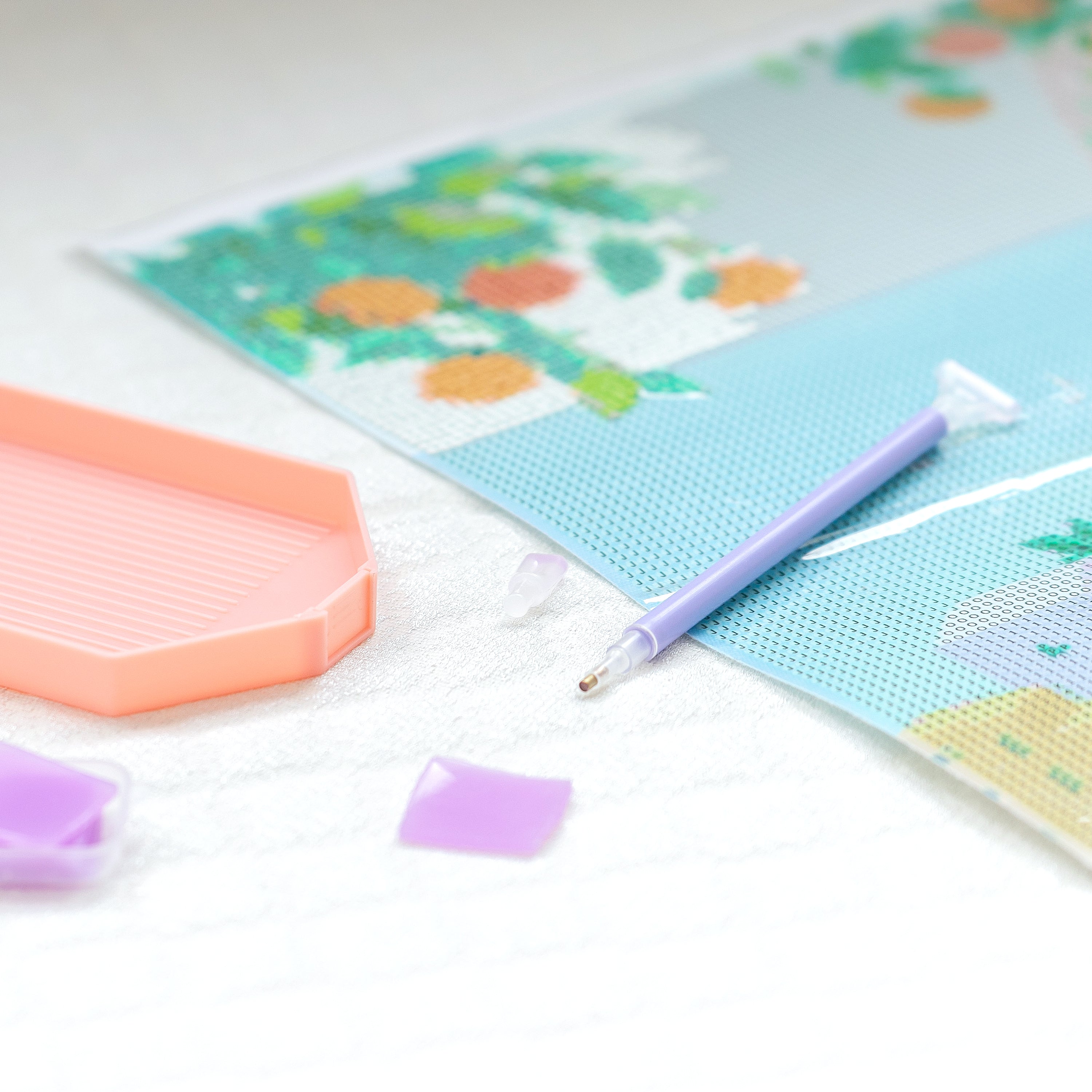 Commencez par déplier la toile et identifiez les diamants à coller sur la toile : chaque sachet correspond à une couleur répertoriée sur le schéma et sur votre toile.