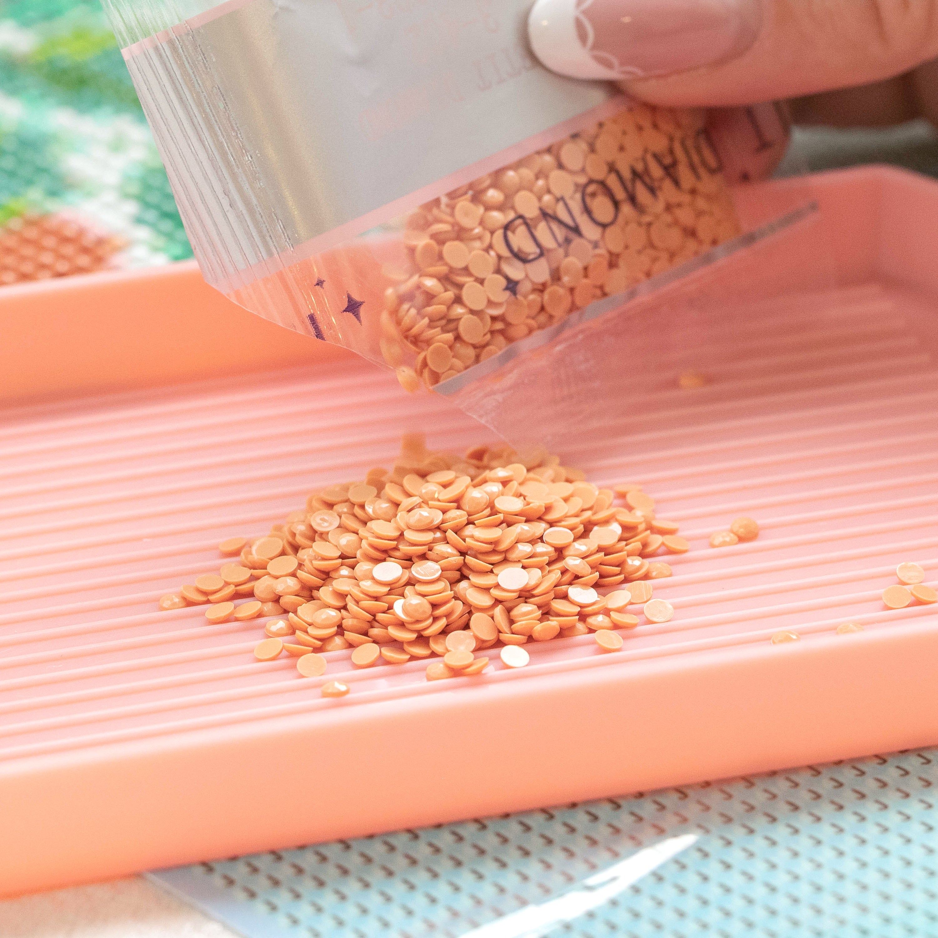 ✦ Tapotez la boîte sur les côtés pour aligner les diamants en rangées avec le côté biseauté des diamants face à vous.