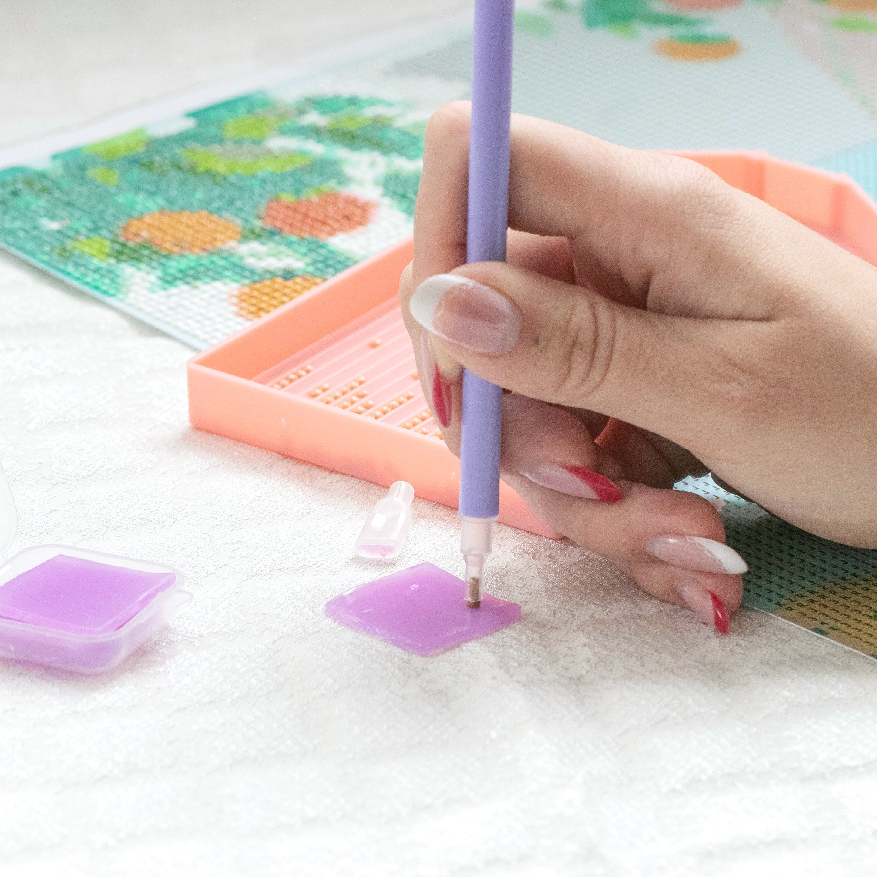 La petite boite transparente contient une cire adhésive vous permettant de faire adhérer vos diamants à votre stylet plus facilement, pour ensuite venir les déposer sur la toile adhésive.