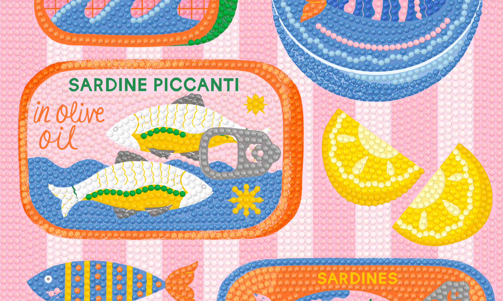 Le Petit Diamond Sardine Cans joue la carte de l’humour et des couleurs pour un moment créatif plein de bonne humeur. Ce kit de diamond painting revisite les boîtes de sardines dans un univers graphique, pop et délicieusement rétro pour faire frétiller votre déco !